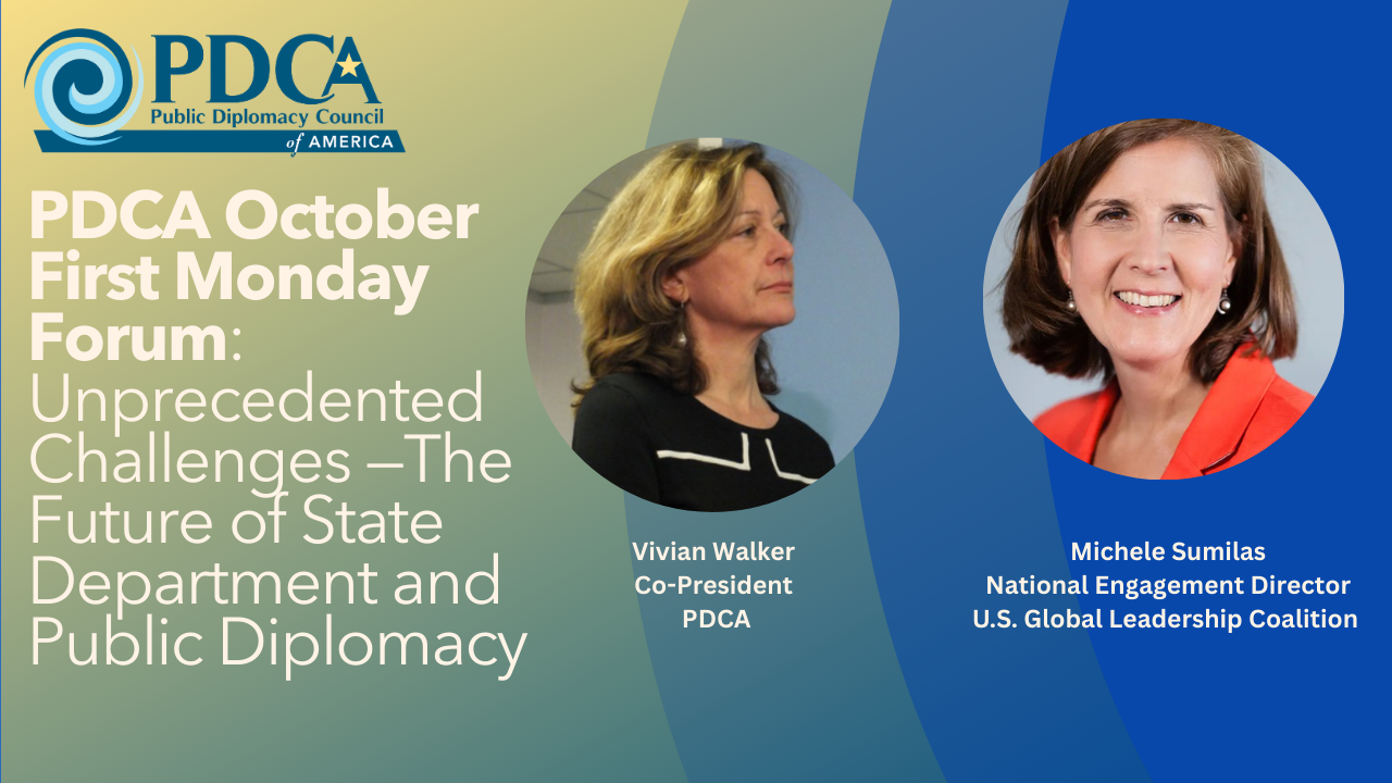 The First Monday Forum is co-sponsored by PDCA and its partners the USC Annenberg Center on Communication Leadership & Policy, the GWU Institute for Public Diplomacy & Global Communication, and the Association for Diplomatic Studies & Training.