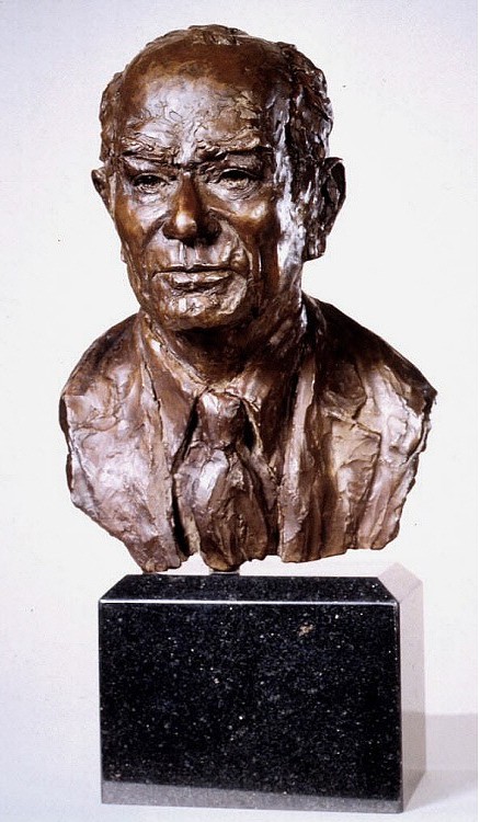 After retiring from the Senate in 1974, Fulbright became a partner at Hogan & Hartson, one of the most prestigious Washington law firms at the time, and his partners commissioned a bronze bust of Fulbright to commemorate his achievements. Gretta Bader, a sculptress renowned for her portraits, crafted the bust that was gifted to the National Portrait Gallery in 1982. This bust – enhance by a small commemorative plaque – was put on permanent display at the Kennedy Center on March 13, 1990, and initially displayed outside of the box tier in the Kennedy Center’s Opera House lobby.Gretta Bader also sculpted a full-length statue of Fulbright that has become a landmark on the campus of the University of Arkansas in Fayetteville. (She incidentally was married to William “Bill” Bader, who worked on Fulbright’s staff in the later 1960s and served as the first Assistant Secretary of State for Educational and Cultural Affairs from 1999 to 2001.) President Clinton dedicated this Fulbright statue at the University of Arkansas on October 21, 2002, in a ceremony that highlighted the 50th anniversary of the German-American Fulbright Educational Exchange Program. It stands in front of the main entrance to Old Main, the historical centerpiece of the University of Arkansas that housed the university’s College for Arts and Sciences that was renamed the Fulbright College of Arts and Sciences in his honor in 1988.