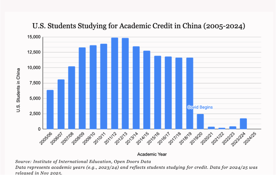 Before he departed his ambassadorial assignment in Beijing in January 2025, Ambassador Nick Burns asked public diplomacy staff to determine how many U.S. students were studying in the People’s Republic of China (PRC). Contacting Chinese universities, they came up with 1,104, a huge decrease from 11,000 in 2019.